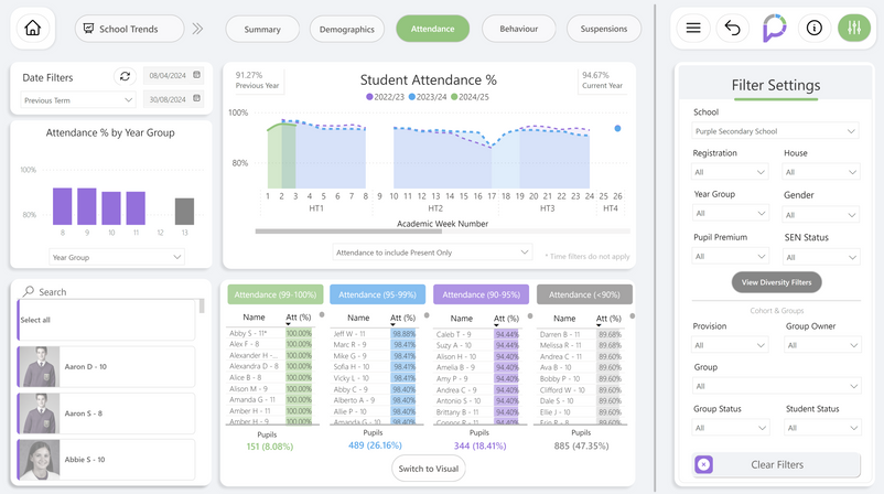 Whether it’s identifying patterns of absenteeism, tackling behavioural challenges head-on or celebrating wins, we offer actionable insights in a simple, visually intuitive manner.